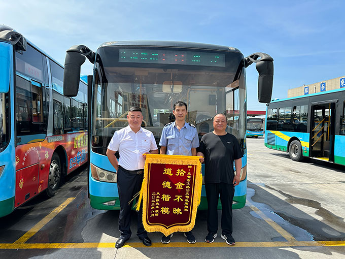 8月1日,陳先生將一面寫(xiě)有“拾金不昧,道德楷?!钡腻\旗送到市公交集團(tuán)汽車(chē)六隊(duì),感謝131路駕駛員周鵬鵬師傅拾金不昧。