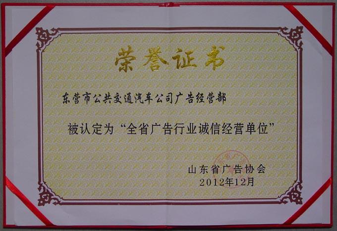 近日,市公交公司廣告部獲山東省廣告協(xié)會頒發(fā)的2012年度“全省廣告行業(yè)誠信經(jīng)營單位”證書,成為我市獲此殊榮的四家單位之一。