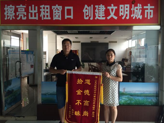 出租車(chē)駕駛員曲志波發(fā)現(xiàn)遺失物品后立即送到市公交公司出租運(yùn)營(yíng)中心,在運(yùn)營(yíng)中心的幫助下聯(lián)系上了孔女士,將遺失在出租車(chē)上的物品如數(shù)歸還,乘客為了表示對(duì)出租車(chē)駕駛員的感謝,于7月27日委托其丈夫送來(lái)錦旗一面。