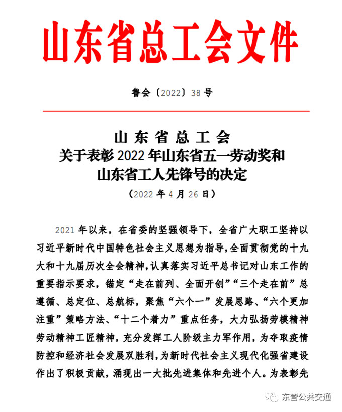 為進一步激勵廣大職工在新時代勇?lián)率姑?,展現(xiàn)新作為,“五一”前夕,山東省總工會和東營市總工會先后印發(fā)通報表彰,對省市多家先進集體和個人進行表彰,東營市公共交通汽車公司駕駛員黃新強同志被評為山東省五一勞動獎章,東營市公共交通汽車公司9路車組被評為東營市工人先鋒號。