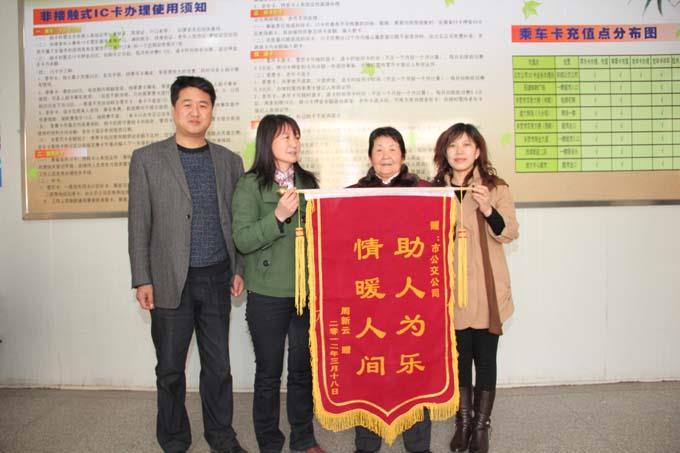 3月20日早上8:30分,一位年邁花甲的周阿姨在家人的陪伴下來(lái)到市公交公司信息中心IC卡業(yè)務(wù)辦理處,送來(lái)一面“情暖人間,助人為樂(lè)”的錦旗,以此來(lái)感謝市公交公司IC卡業(yè)務(wù)辦理處職工耿瑞華及王海紅尊老愛幼、助人為樂(lè)的優(yōu)良品質(zhì)。