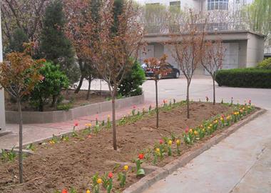 郁金香花開了,櫻花樹紅紅的小花含苞待放。 一陣微風(fēng)吹來,或春風(fēng)含面,或低頭不語,時不時引來三三兩兩的小喜鵲駐足觀望,一派春意盎然、安定祥和的美景。